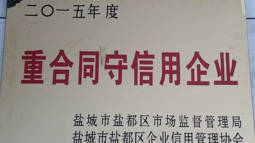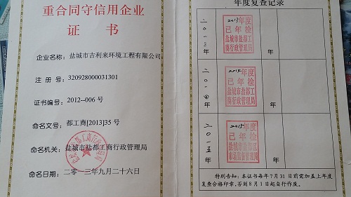 祝賀鹽城市吉利來(lái)環(huán)境工程有限公司連續(xù)四年獲得鹽城市場(chǎng)管理監(jiān)督局頒發(fā)的“重合同,守信用企業(yè)”證書